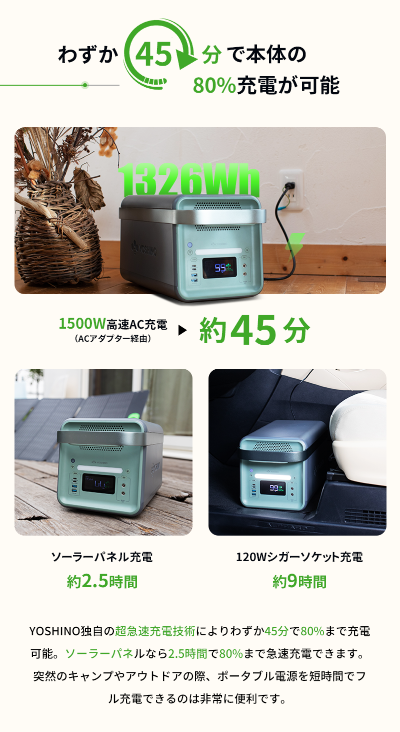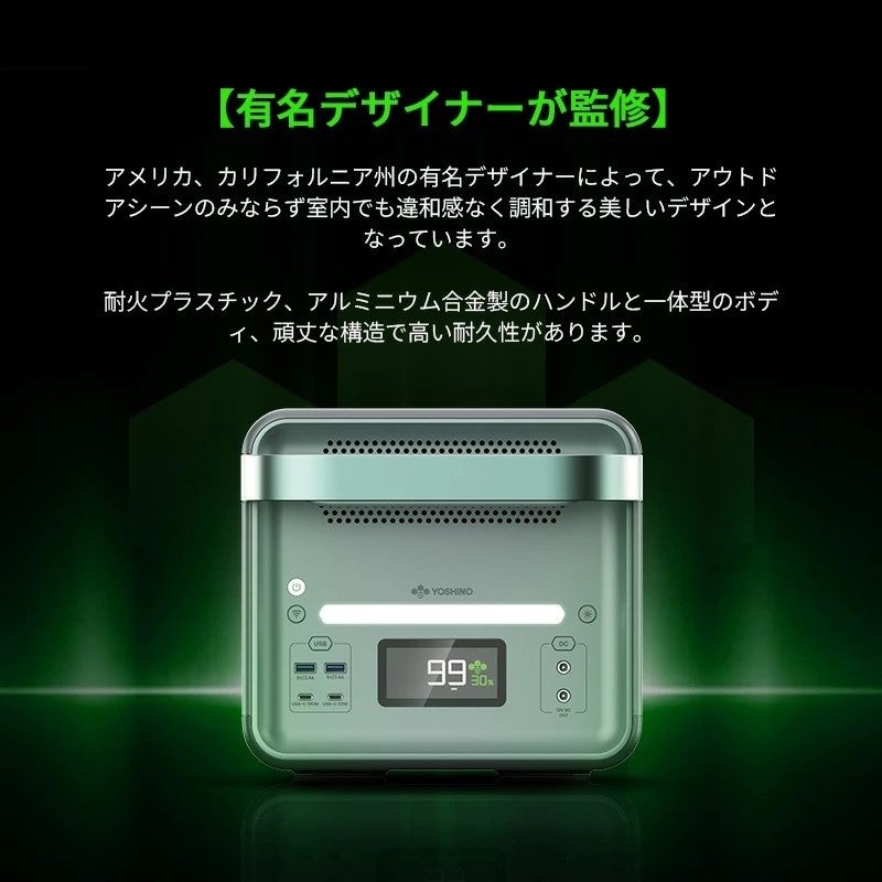革新的な製品であるYOSHINOの固体電池ポータブル電源は、固体電池の特性である「高い安全性」、「高エネルギー密度」、「小型・軽量化」、「バッテリー寿命の向上」といった特徴と洗練されたデザインを有し、キャンプをはじめとしたアウトドアや災害時の予備電源としてなど、様々な場面で活躍できます。