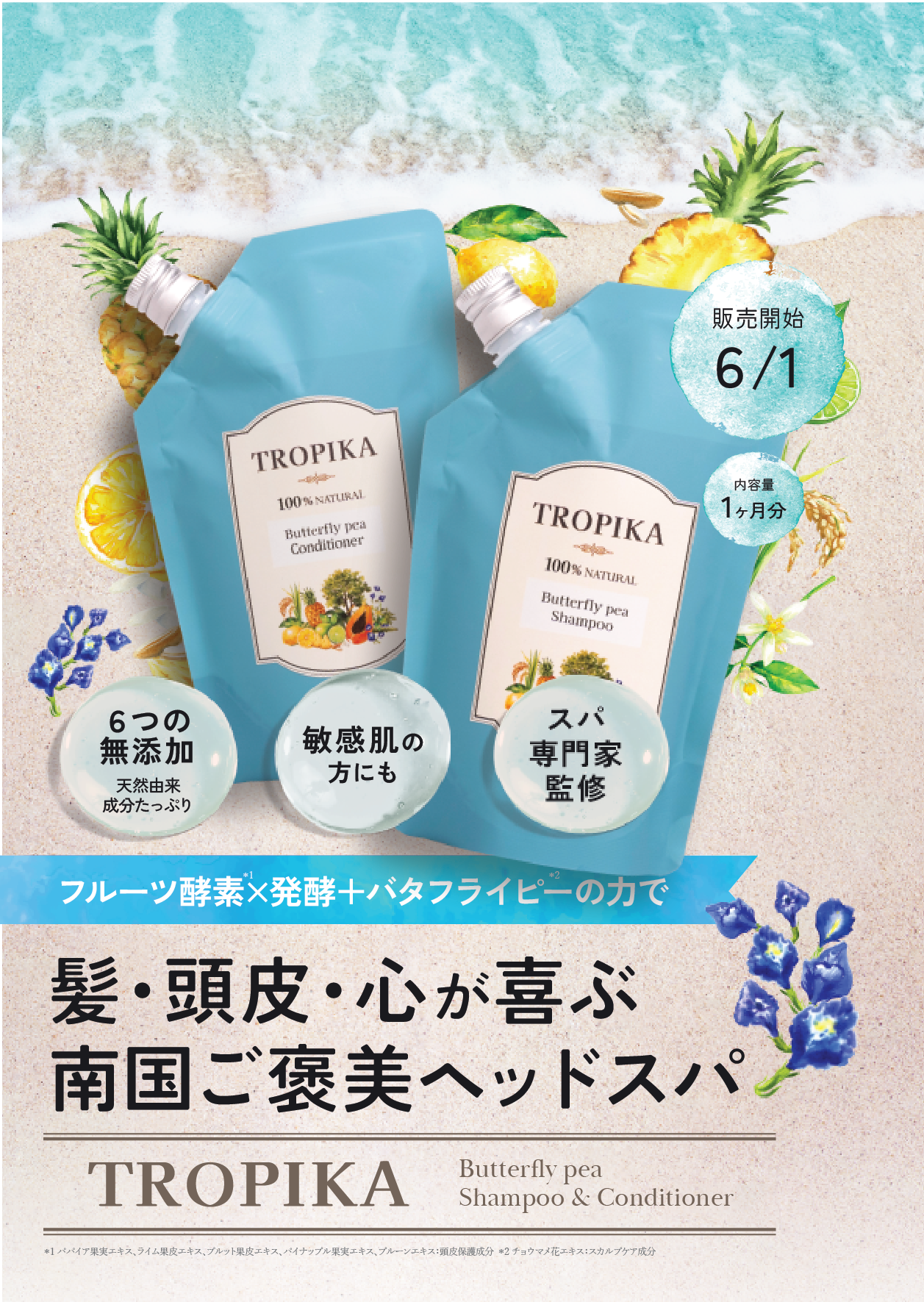 「TROPIKA」第1弾として販売を開始するのは、フルーツ酵素をベースにしたシャンプーに、東南アジアでは古くから髪のエイジング悩みに使われてきたバタフライピー(*3)のフラワーエキスをたっぷり入れたフルーツ酵素シャンプーとバタフライピーのコンディショナーです。