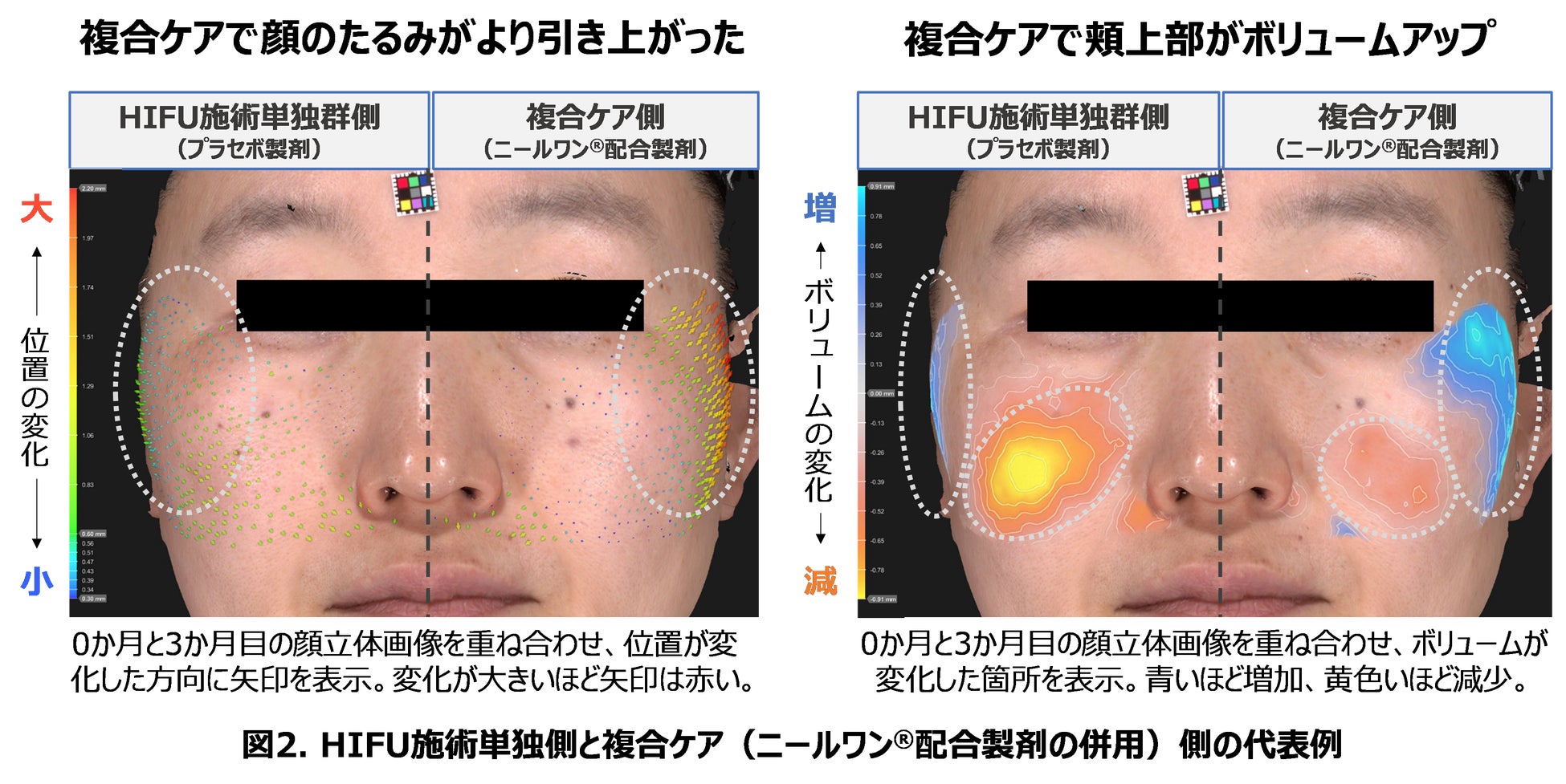 医師による顔のたるみ改善度評価において、複合ケア側の方がHIFU施術単独側より改善度が高かったことから(図1)、ニールワン®配合製剤との複合ケアはHIFU施術単独より効果が高いことが示されました。