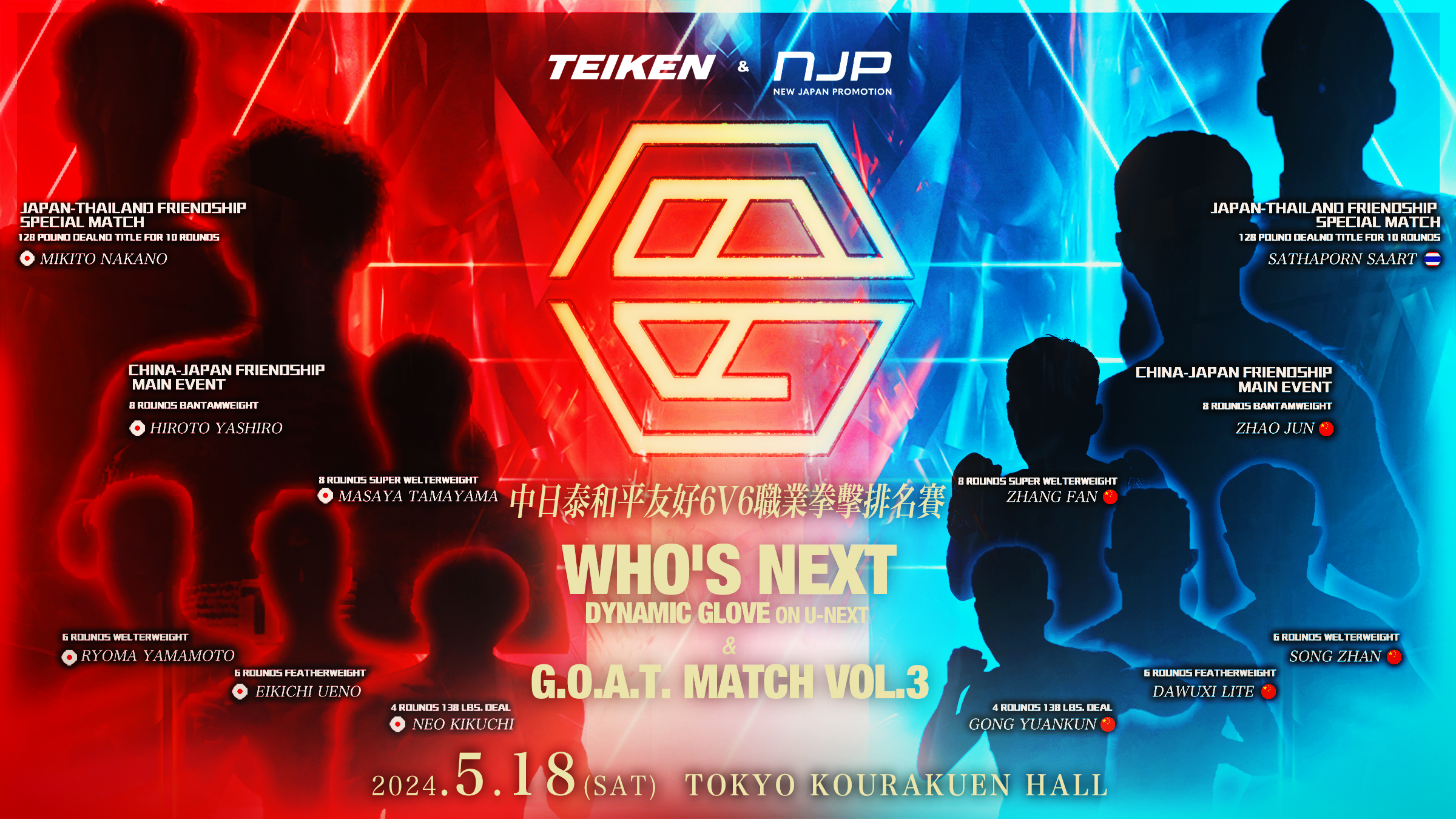 注目イベント:5月18日(土)「WHO'S NEXT DYNAMIC GLOVE on U-NEXT」 & G.O.A.T. MATCH 第3弾、日中タイ友好親善6V6が東京・後楽園にて開催されます