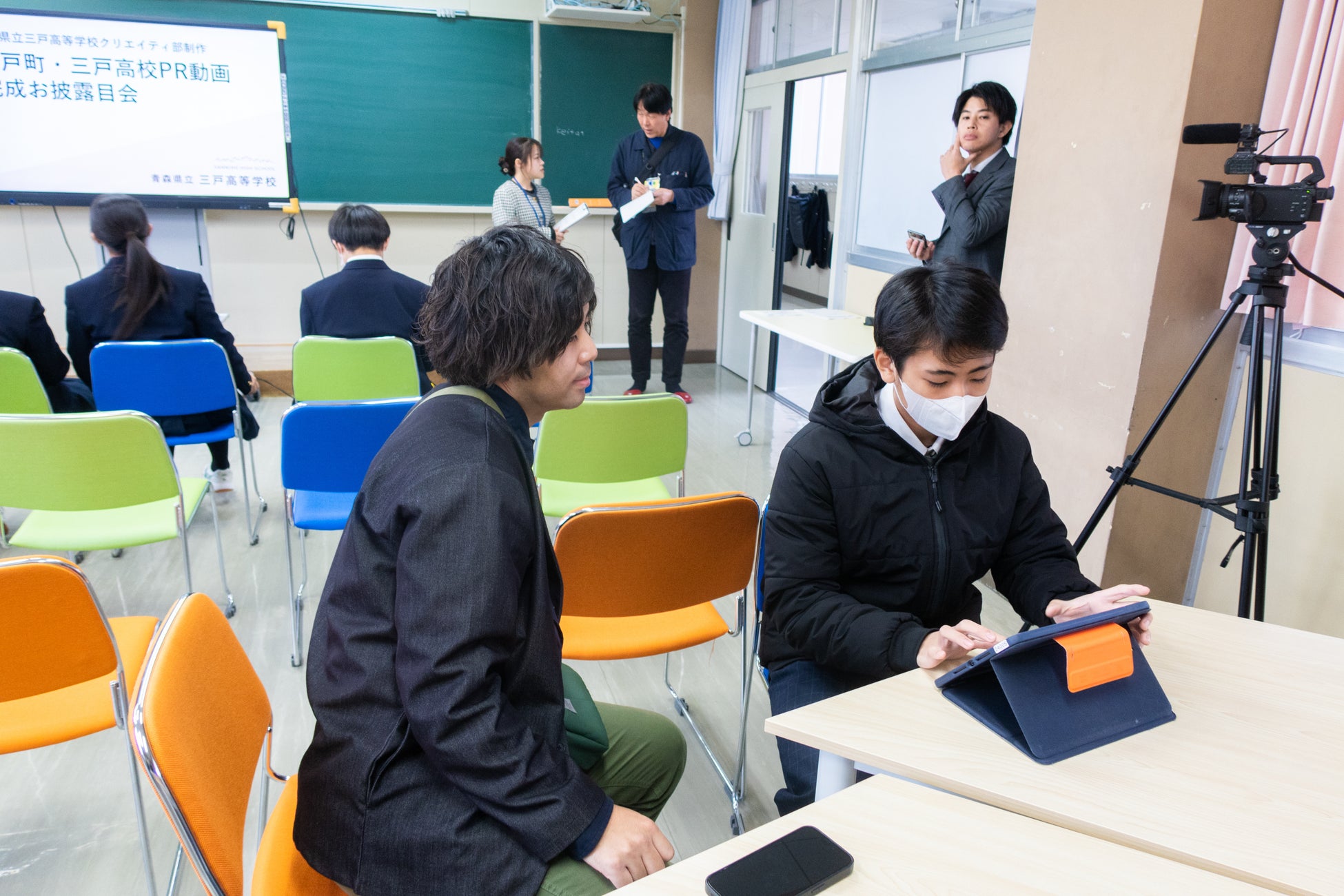ポスターが完成した後は、三戸高校の部活動「クリエイティ部」の部員たちがポスターのアイデアをベースにCMを作成しました。ポスターのアイデアをベースに動画を作る。撮影はスマホ、編集も学校のタブレットを使って自分で行いました。