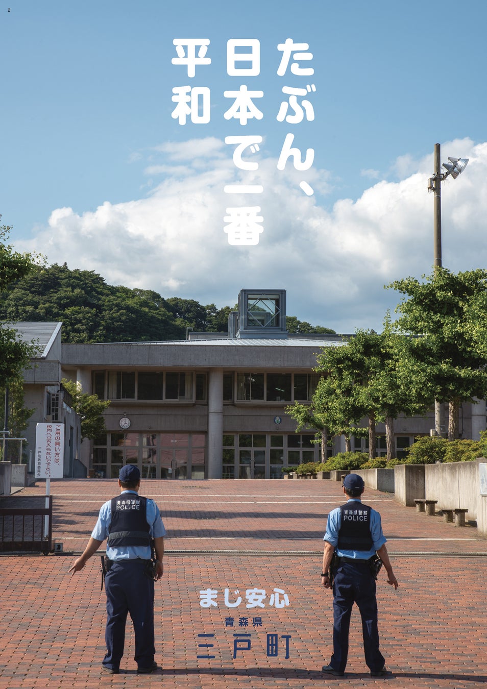 三戸って治安いいよな〜、事件ないよな〜といった住んでいる実感をポスターにしました。本物の警察官に協力をしてもらって撮影しました。警察官の手にご注目ください。