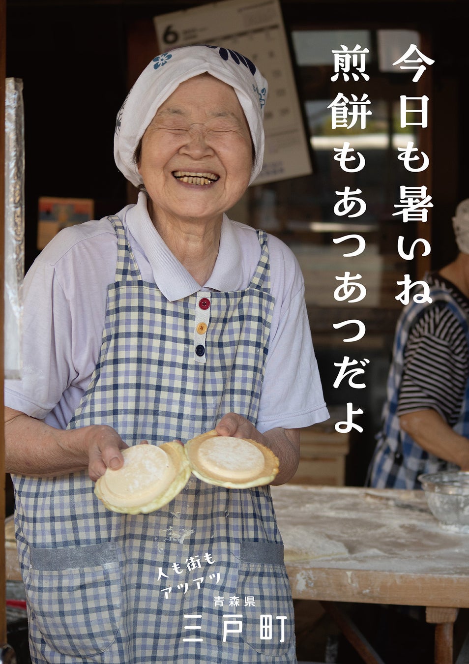 三戸町の高齢者って元気だよな、ということから発想を広げ、三戸名物の南部せんべいと、せんべい屋さんのおばちゃんの笑顔で人間のあったかさを表現しました。
