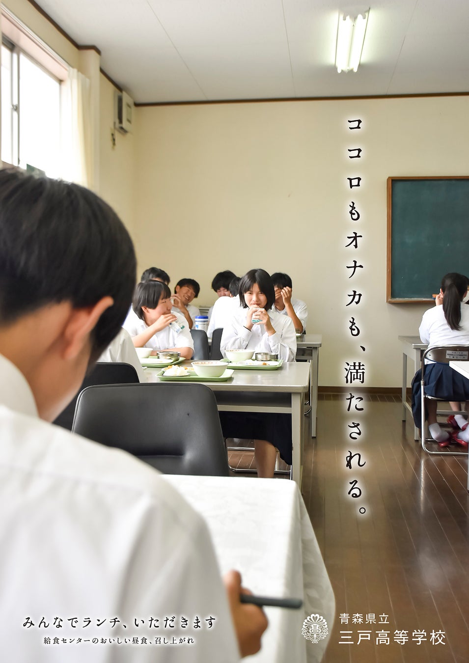 三戸高校には、高校としては珍しい「昼食提供」があります。それがいつも結構おいしくて楽しみにしている生徒も多くいます。おいしい昼食をみんなで食べられること、そして、そこにある思わぬドラマを表現しました。