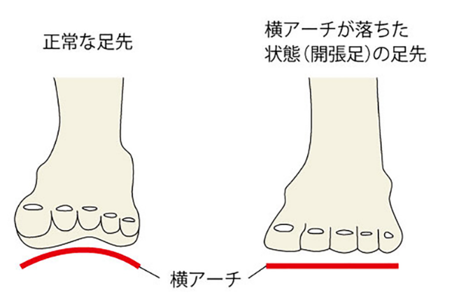 開張足とは、5本の指のつけ根を横に結ぶアーチの形が崩れて、足の指が横に広がってしまう状態のことです。