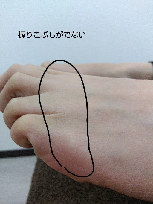 ③ 足指を折りたたむように丸めた際に、足指の付け根部分に骨の突起が見受けられなかったり、触って骨のゴツゴツした感触も感じられない。