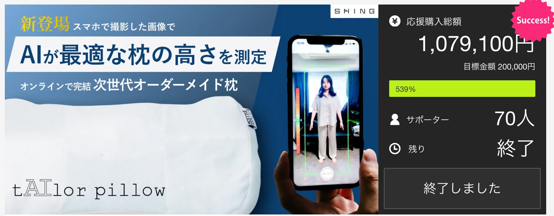 「SHING ORDER PILLOW」はMAKUAKEでのクラウドファンディングにおいて、約100万円の資金を調達しました。初めてのクラウドファンディングで500%の達成率を誇り、多くの支援者からの信頼をいただきました。