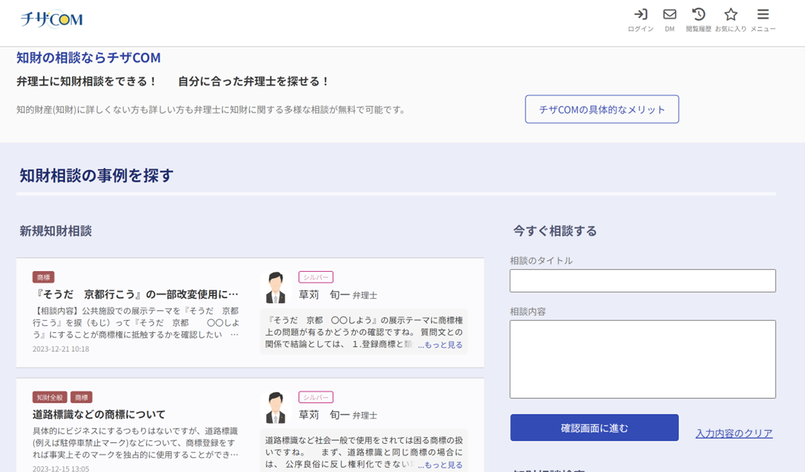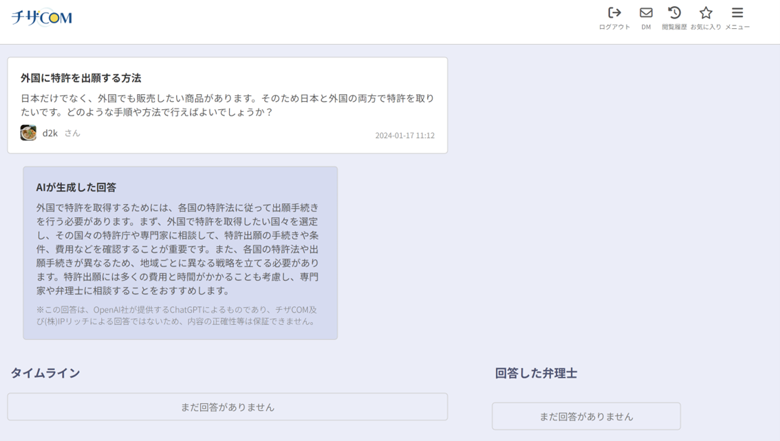 チザCOMは、知財に関するコミュニケーションを円滑にし、知財に関するあらゆる疑問や悩みを解消したり、相談者と弁理士の適切なマッチングをしたりするためのプラットフォームです。例えば、以下のように知財に関する相談を投稿すると、知財専門家である弁理士が回答をします(必ずしも弁理士からの回答を得られる訳ではありません)。