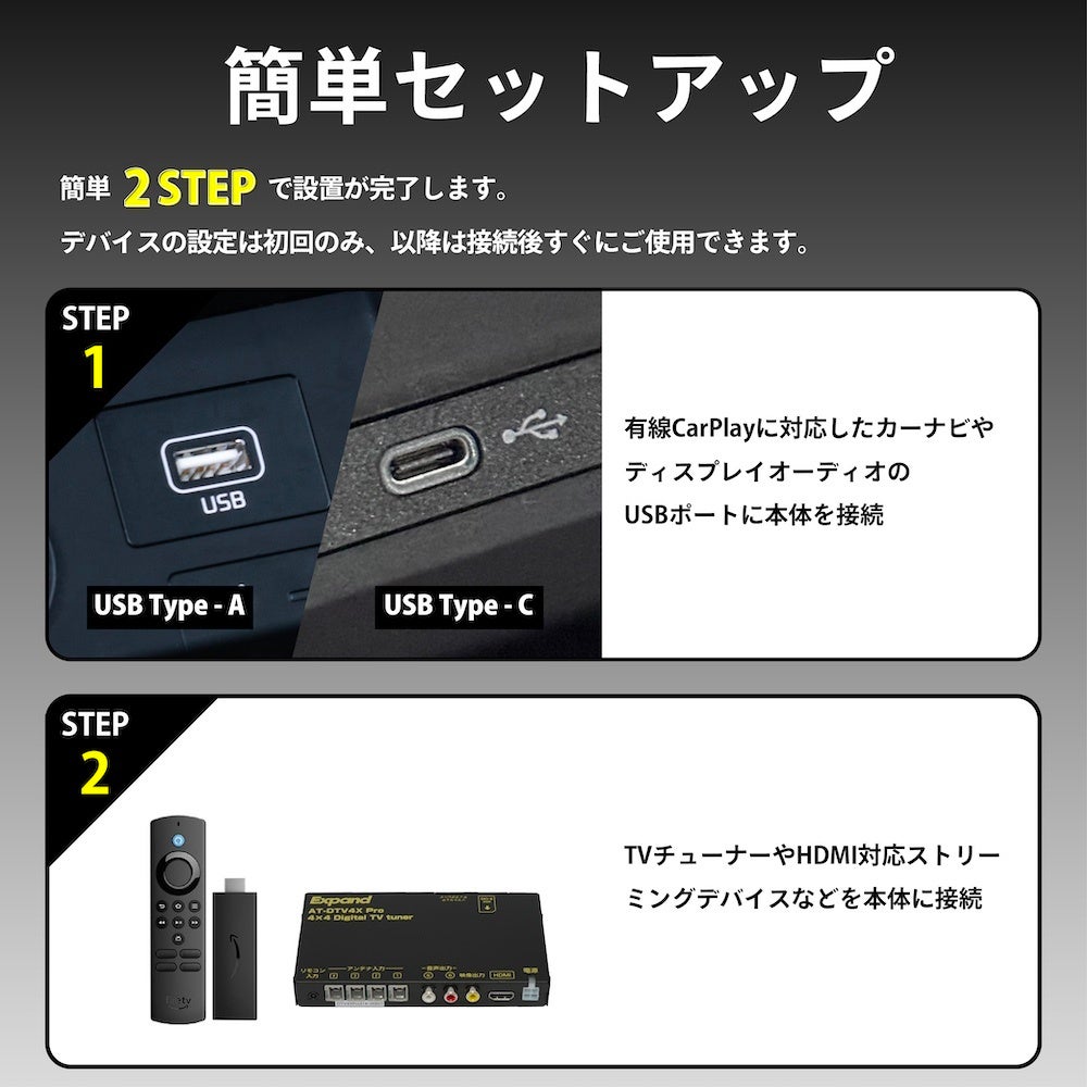 本製品は、車両のCarPlay対応USBポートに本体を接続し、HDMI機器(TVチューナー・ストリーミングデバイス・ゲーム機など)を本体のHDMI入力端子に接続することで、テレビ・配信動画・ゲームなど様々なコンテンツを楽しむことができます。