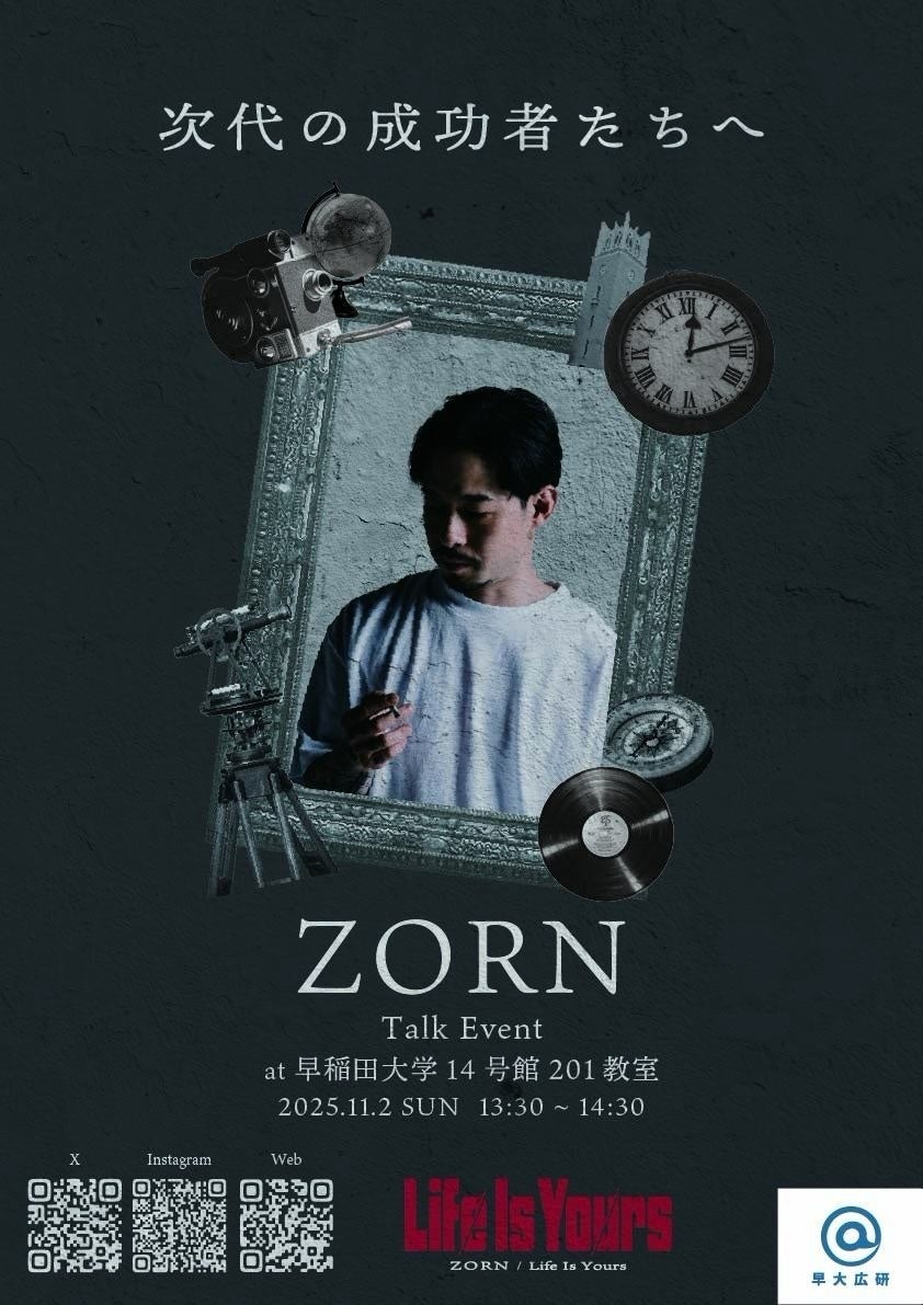 ZORN(ゾーン)1989年、東京都葛飾区出身。2004年からラッパーとして活動を開始し、数々の楽曲、アルバム、EPを発表してきた。代表曲には『All My Homies』、『家庭の事情』、『My life』などがある。また、2019年まで所属した昭和レコードから独立、自身のレーベルであるAll My Homiesを設立した。