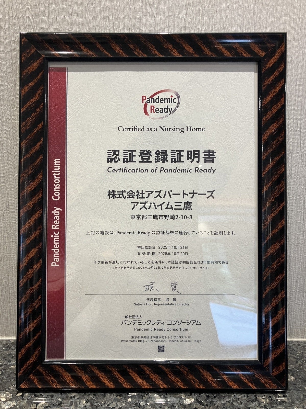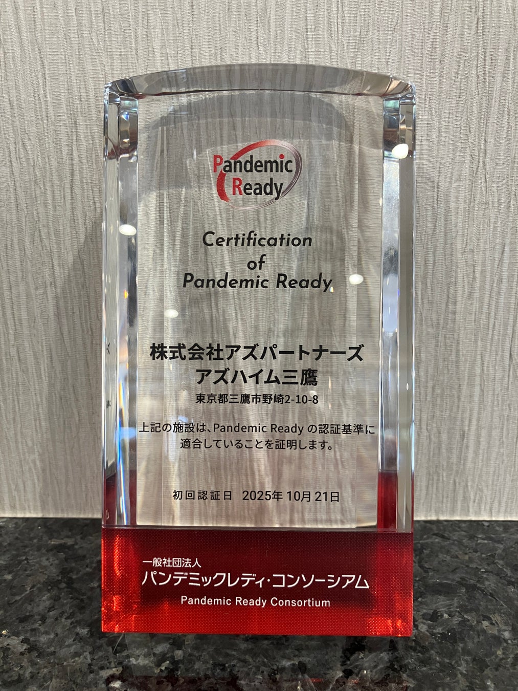 一般社団法人パンデミックレディ・コンソーシアムは感染症リスクを低減させる施設基準を満たした施設として「パンデミックレディ施設認証」をアズハイム三鷹に授与