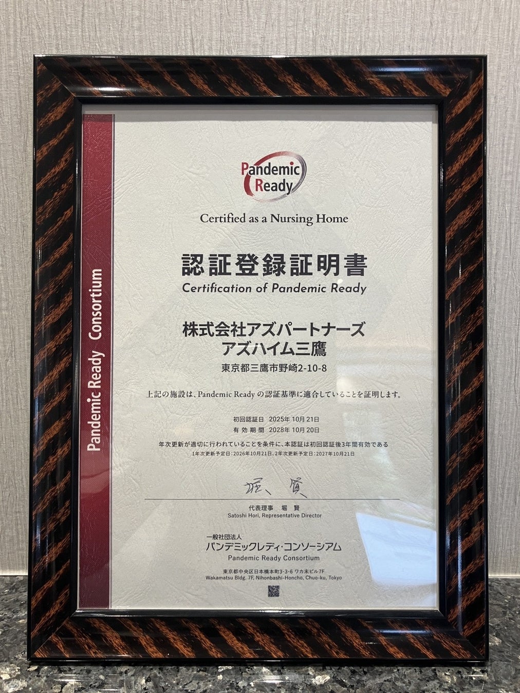 株式会社アズパートナーズ(東京都千代田区、代表取締役社長 兼 CEO 植村健志、以下アズパートナーズ)と一般社団法人パンデミックレディ・コンソーシアム(東京都中央区、代表理事 堀賢、以下パンデミックレディ・コンソーシアム)はアズパートナーズが運営する介護付き有料老人ホームの「アズハイム三鷹」が2025年10月21日に感染症対策の基準に適合した施設として国内外で初めて「パンデミックレディ施設認証」を取得したことを発表します。