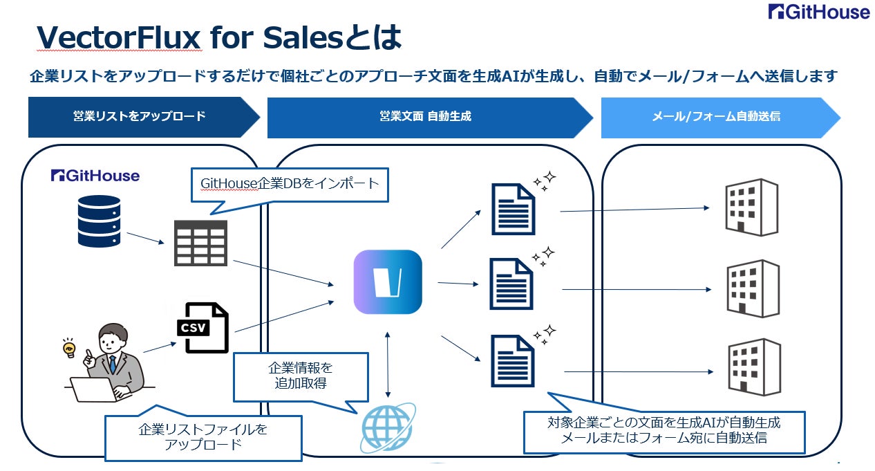 株式会社GitHouse(本社:東京都港区、以下「GitHouse」)は本日、AIによる1to1営業文面自動生成・送付を可能にする新サービス「VectorFlux for Sales」をリリースします。
