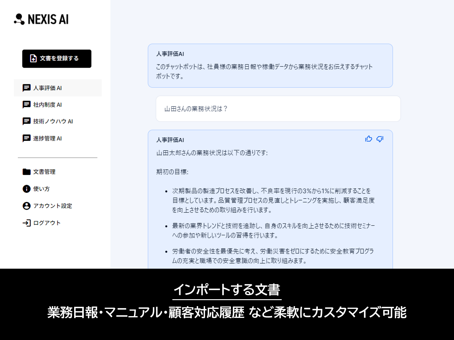 ▲技術承継や人事評価の観点で適切な答えを導く弊社のAIチャットボット「NEXIS AI」