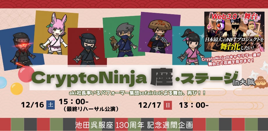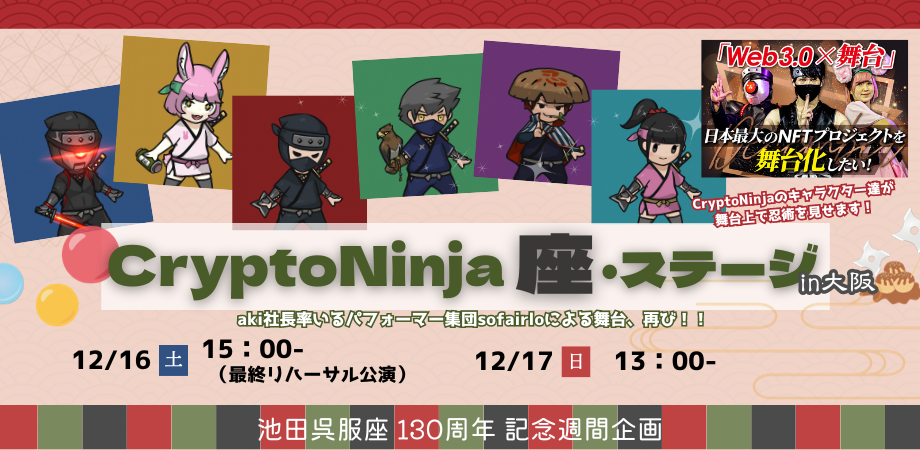 国内最大級のNFTキャラクタのcryptoninja(クリプト忍者)、そしてTVアニメの”忍ばない忍者 咲耶”が、舞台に登場します!パフォーマー集団 Sofairloによるクリプト忍者デジタルパフォーマンスと物語のある芝居です。クラウドファンドで、NFTがチケットとなるアーカイブ配信や、片親家庭の子供たちにも舞台をみせる試みも実施します。12月16日、17日に、その会場として、130周年記念の大阪の池田呉服座で実施します。