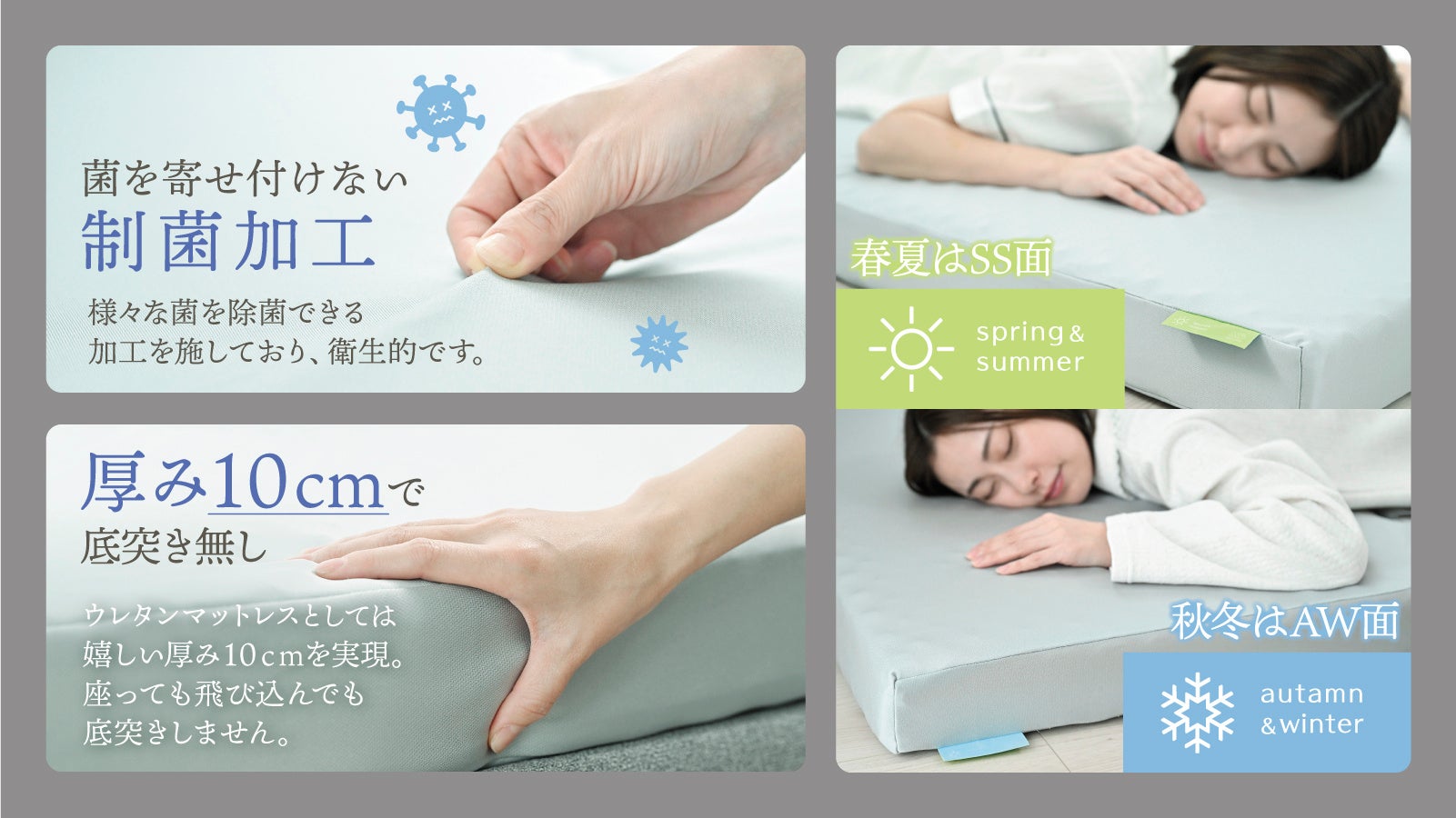体圧分散性や寝返り性の試験は勿論の事、発汗機能付きのサーマルマネキンを使用した放湿量や放熱量を計測した試験では、春夏面では1.15倍の快適性と1.36倍の涼しさを、秋冬面では1.6倍の暖かさが確認されました。制菌加工も施されており、三つ折り仕様で収納や持ち運びにも便利です。