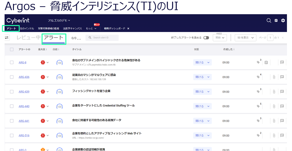 アタックサーフェス管理と脅威インテリジェンスを単一のプラットフォームで提供するサイバーイントのアルゴス プラットフォームのユーザーインターフェースの一部 :