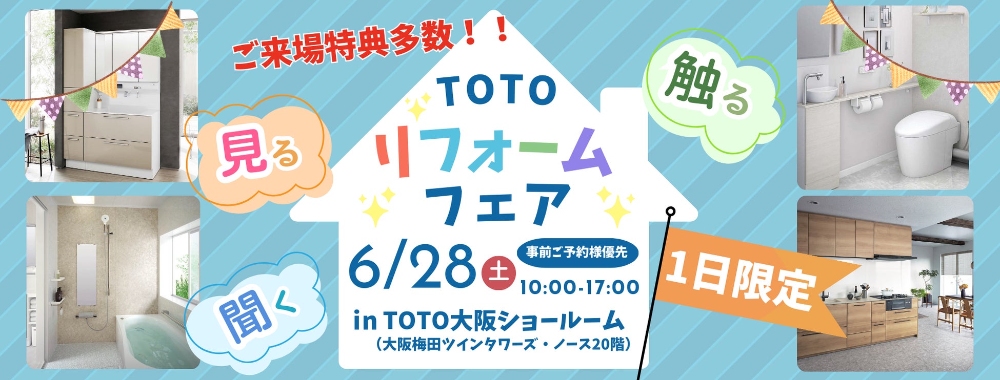 2025年6月28日(土)、TOTO大阪ショールーム(大阪梅田ツインタワーズ・ノース20F)にて、水まわりリフォームをご検討中の方に向けた「リフォームフェア」を開催いたします。