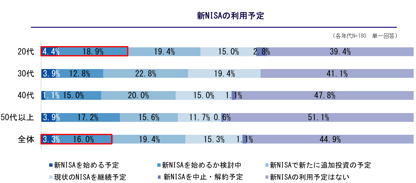 NISAの利用状況について聞いたところ、現在利用している人は約36%。新NISAを機に利用開始予定・検討中の人は全体で約19%で、世代別では20代が最も多い約23%と、これまでNISAを始めていなかった人もNISA運用を始める機運があることが明らかになりました。現在利用している人とこれからNISAを始めようと思っている人を合わせると半数超となり、これからますますNISAの利用率が上がっていくものと予想されます。