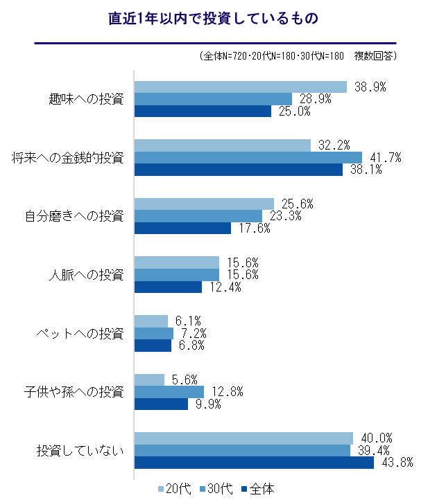 直近1年以内で投資しているものについて、 20代は「趣味への投資(推し活、趣味活動など)」、30代以上は「将来への金銭的投資(資産形成、NISAなど)」が第1位でした。また、20代は「趣味」「自身のスキル(勉強、資格取得など)」への投資の回答割合が高く、「未来よりも今」への投資を優先している傾向がわかりました。