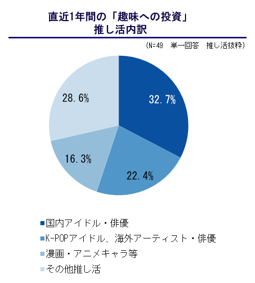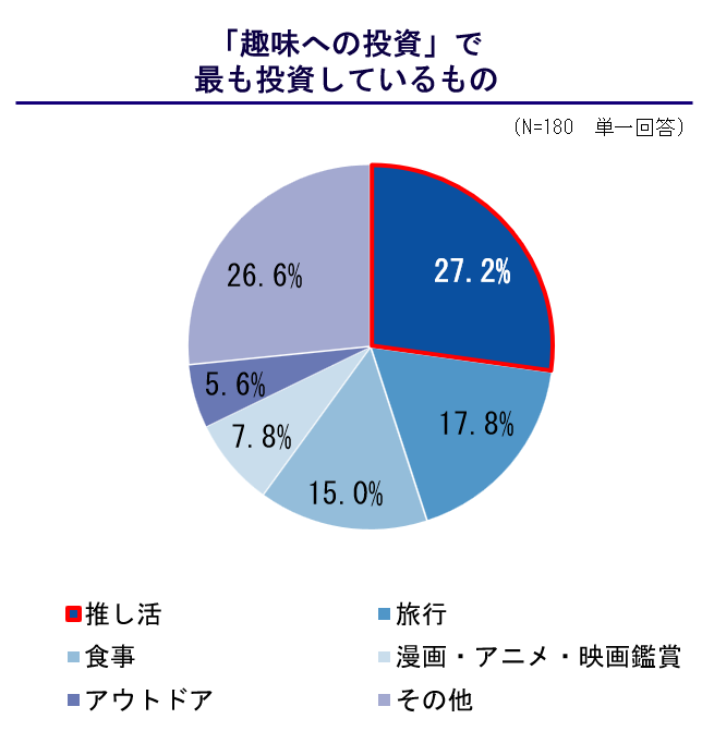 また、最も投資している推し活については、「国内アイドル・俳優」が第1位、「K-POPアイドル、海外アーティスト・俳優」が第2位、「漫画やアニメキャラなど」が第3位という結果になりました。