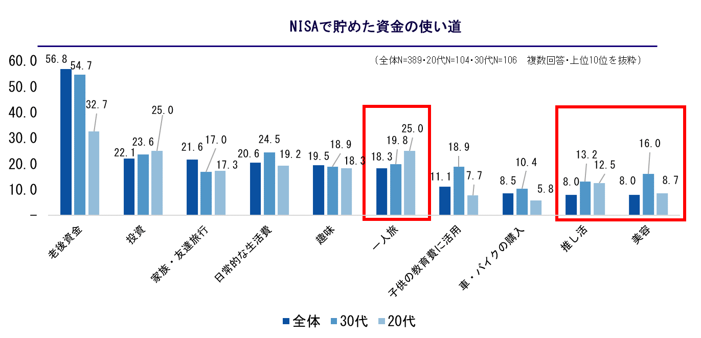 年代別に見ると、特に20代では、『今』の投資の中でも「一人旅」「推し活」「美容」などを重視する回答が多い結果でした。一方30代では、20代と同様「推し活」「美容」など『今』にお金をかけつつも、「老後資金に充てる」との回答が20代と比較して多く、30代になると大きなライフイベントを迎える人も多いことで、より将来の備えのためにNISAの活用を検討する傾向にあることがわかりました。