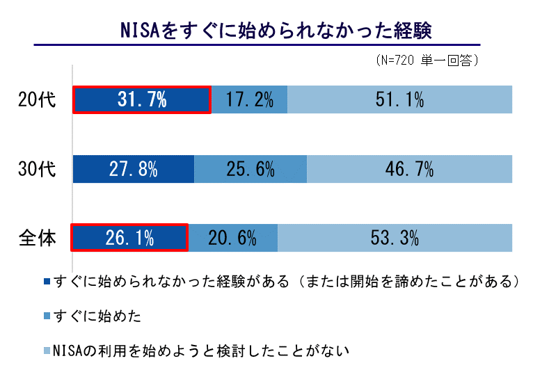 投資への意欲はある一方で、NISAを始めようと思ったが「すぐに始められなかった」と答える人が全体で約26%いました。特に20代は約32%、30代は約28%が回答し若い世代ほど足踏みをしてしまった経験があることがわかりました。