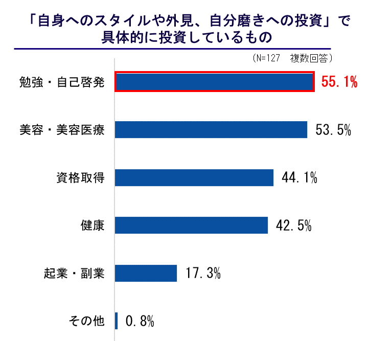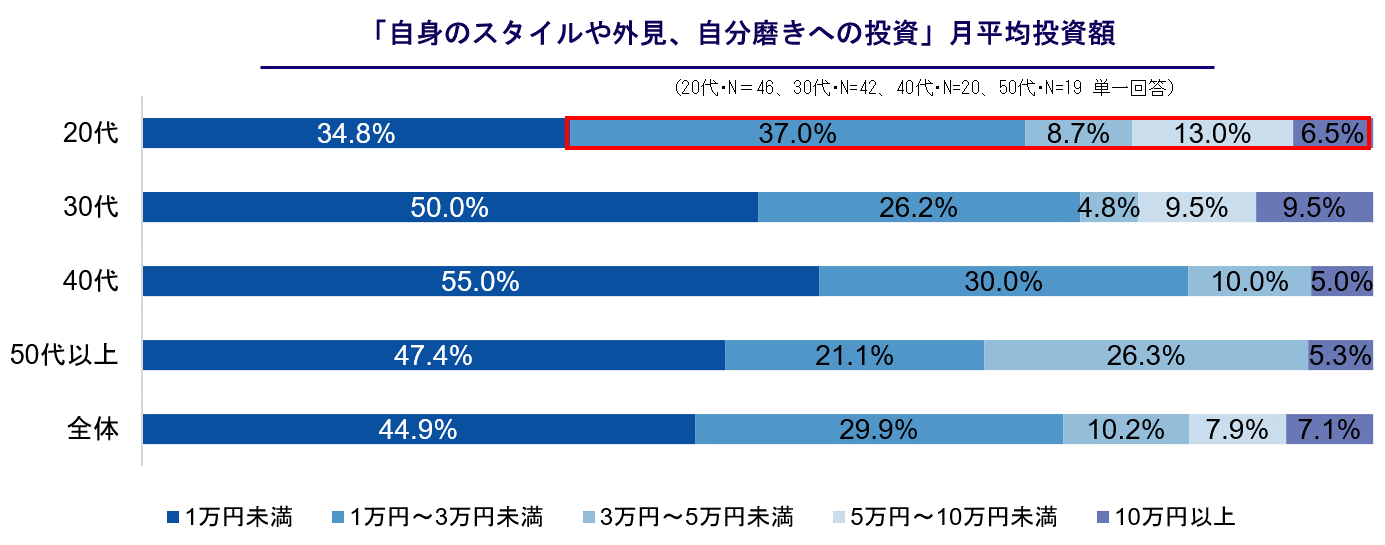 「自身のスタイルや外見、自分磨きへの投資」については、「勉強・自己啓発」への投資が第1位となりました。投資金額について、全体では1万円以内が約45%を占めていた一方で、20代の約37%は「1~3万円」と回答し、約28%は3万円以上と回答するなど、自己投資にお金をかけている傾向が見られました。