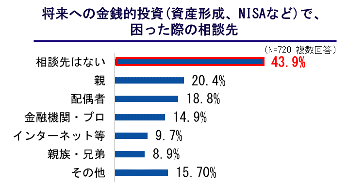さらに、将来への金銭的投資(資産形成、NISAなど)の困った際の相談先について聞くと、全体の40%以上が「相談先がない」こともわかりました。