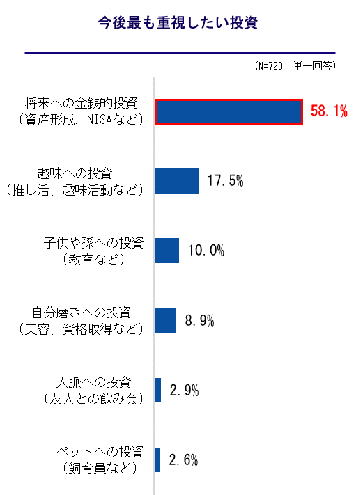 今後最も重視したい投資は、全年代で「将来への金銭的投資(資産形成、NISAなど)」が1位にランクイン。今後最も重視していきたい投資について多い順で並べると、上位から「将来への金銭的投資(資産形成、NISAなど)」、「趣味への投資」、「子供や孫への投資(教育など)」、「自身のスキルや外見、自分磨きへの投資(美容、勉強、資格取得など)」、「人脈への投資(友人との飲み会、サークルなど)」、「ペットへの投資(飼育費など)」という結果になりました。