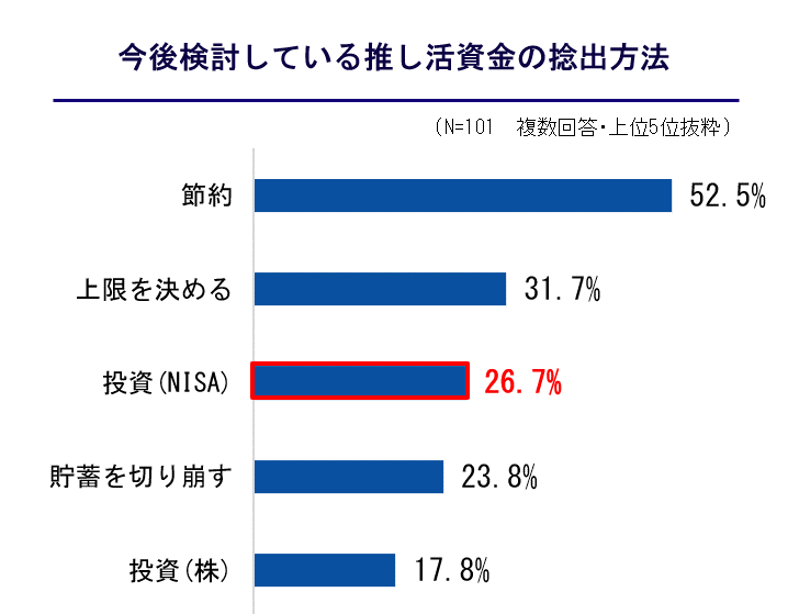 そして、推し活の資金の捻出方法については「節約している」が最も多い約67%、続いて「貯金を切り崩している」が約30%で、節制し資金を捻出している人が多いことが判明。今後の捻出方法では、投資(NISA)を検討している人が約27%と、NISAが注目されていることもわかりました。
