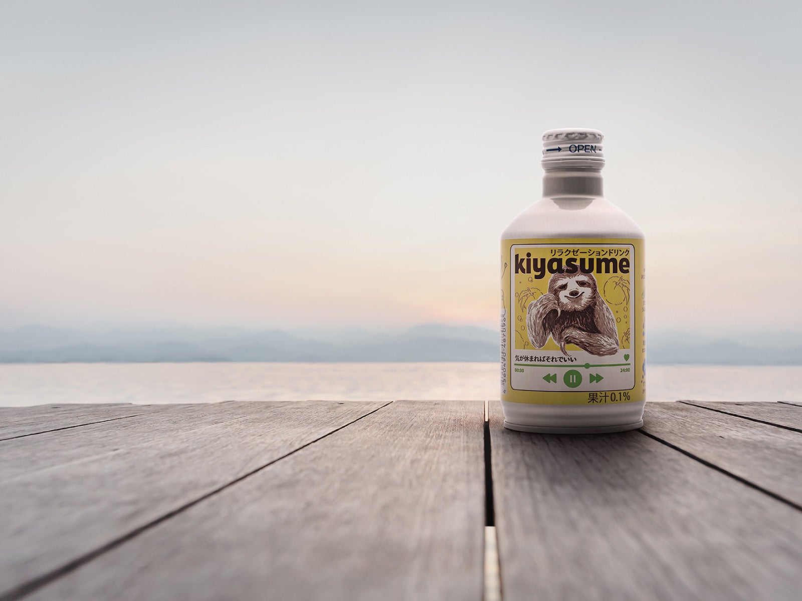 のんびりしたナマケモノが気休め程度のリラックスをお届けします。ゆずのさわやかなフレーバーに、アロエ、乳酸菌、グリシンのやさしさをプラスしました。飲みやすい微炭酸でリフレッシュさも感じられます。また、パッケージの特徴はのんびりしたナマケモノで、音楽を聴いてひと息つくようにkiyasumeを飲んでリラックスしてほしいという思いから、ミュージックプレイヤーをイメージしました。