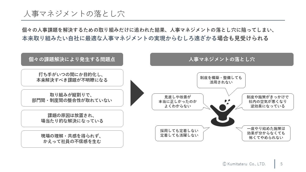 一方で、人事制度や人事施策の強化・改善に取り組むものの、人事マネジメントの「本当の課題」が特定できていないため、いわば「人事マネジメントの落とし穴」に陥ってしまったかのような状況となり、お困りの経営者や人事部門の方からのお悩みの声が増えています。