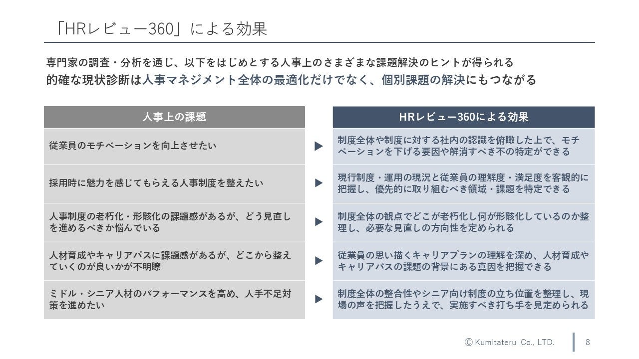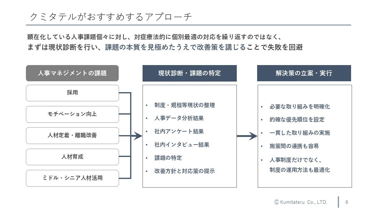 これらの環境変化や企業が抱える課題を踏まえ、「イグジットマネジメント(※)」専業のコンサルティング会社であるクミタテルでは、人材マネジメントに関する豊富な知見を活用することにより企業が自社に最適な人事マネジメントを実現し、活躍する従業員から選ばれる組織となるよう支援するべく、本サービスをリリースしました。