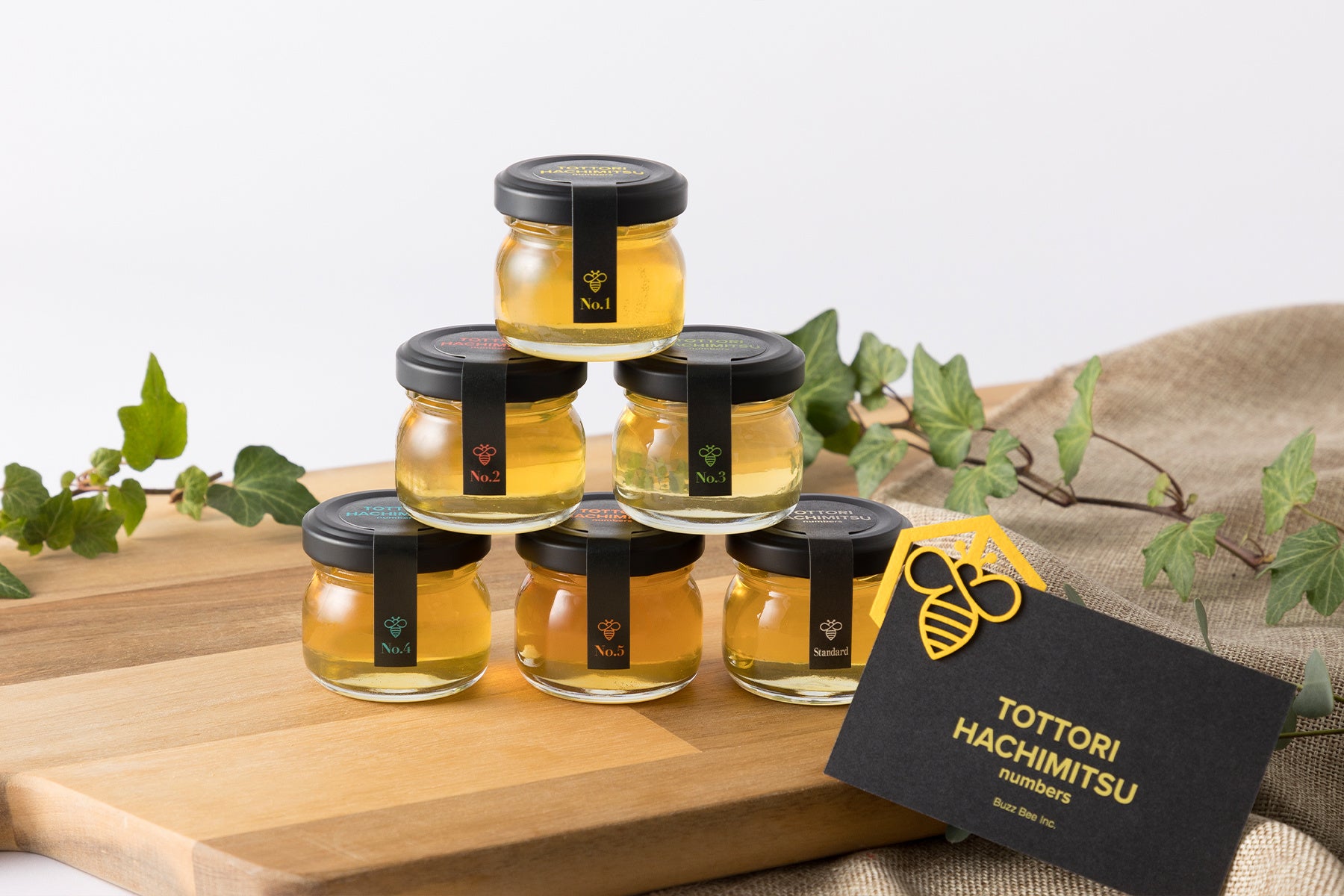 そこに食べ比べの要素を組み込んだ「鳥取はちみつ TOTTORI HACHIMITSU Numbers」は、楽しさもあり、食卓を華やかに彩ります。No.1~5の「鳥取はちみつ」の特徴を記載したカードも同封し、ブラインドテイスティングなど、楽しみ方の幅も広げます。