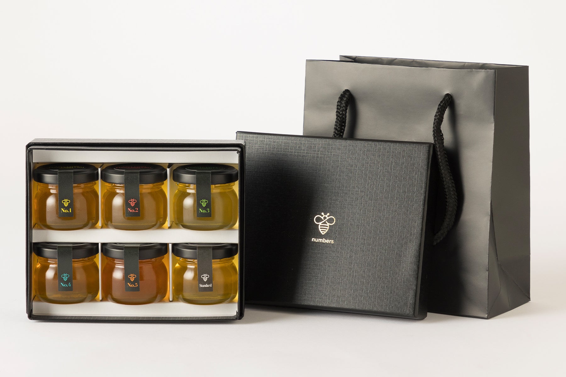 そんな声にお応えし、誕生した「鳥取はちみつ TOTTORI HACHIMITSU Numbers」¥5,400(税込)は、小瓶に入れたNo.1~5の「鳥取はちみつ」と、標準的な「はちみつ」として独自にセレクトしたアカシアの蜜(Standard)をセットにしたギフト仕様。重厚感のあるパッケージで、常温保存できる手軽な手土産としても最適な内容になっております。