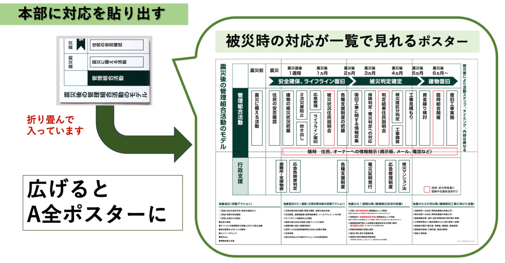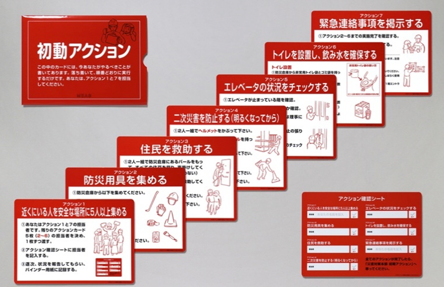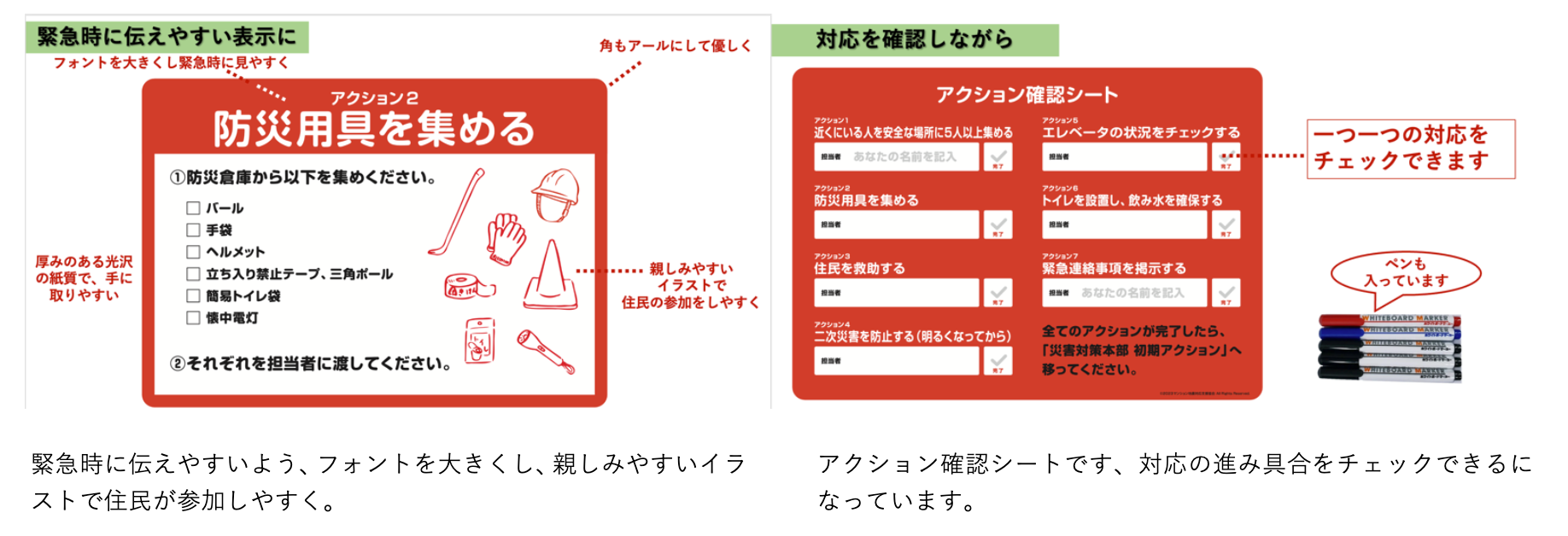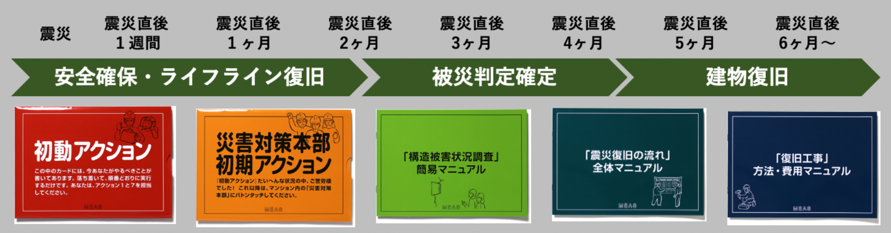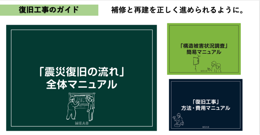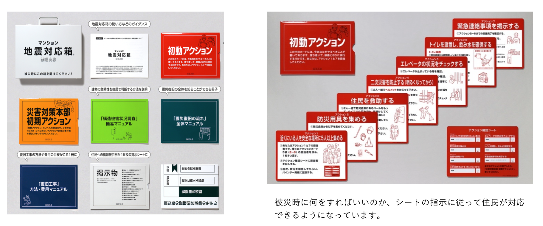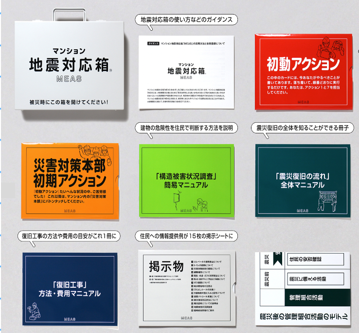 マンションを対象にした、“被災〜復旧までの対応を支援する”防災ツールはこれまでありませんでした。 2019 年に開発された「マンション地震対応箱 MEAS」はリニューアルを重ね、「被災時の道標」(マン ション防災の救急箱)として、マンション住⺠が取るべき対応を順序立て、ツールとしてデザインするこ とで、さらに使いやすくしました。 マニュアルではなく人が行動しやすい「指示書(アクションシート)」である事が特徴です。被災状況を 把握する「構造被害状況調査」、震災復旧の流れを知る「震災復旧の全体マニュアル」、建物の復旧に役 立つ「復旧工事」方法・費用マニュアルは冊子で、マンション住⺠への情報「掲示物」はシートで、災害 対策本部に張り出す「震災後の管理組合の活動モデル」はポスターで用意しました。