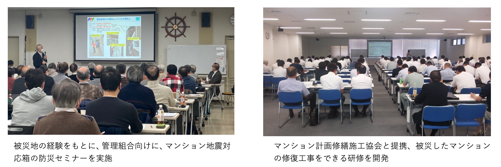 被災地とつないだ「震災対応セミナー」や「被災時支援サービス」を提供しています。管理組合や住⺠が 参加することで、マンション防災力の向上が期待されています。 また、被災時にマンションの復旧工事が大きな問題になったため、マンション計画修繕施工協会(東京都 港区)と提携し正しい修復工事ができる工事事業者を育成する「研修プログラム」の開発、管理組合が復 旧時の工事事業者をマッチングできる「震災時ネットワーク」の設置へ向け、マンション防災を支援する 準備を進めています。
