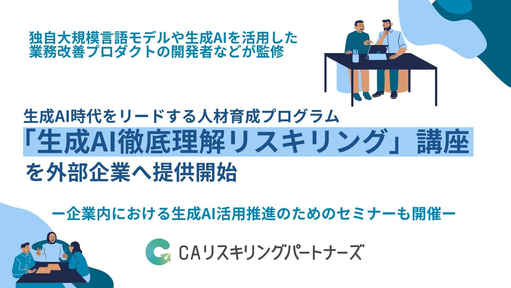 リスキリングにより企業のDX内製化を支援する株式会社CAリスキリングパートナーズ(本社:東京都渋谷区、代表取締役社長:伊藤優 以下「当社」)は、「生成AI徹底理解リスキリング」講座の外部企業への提供を開始いたしました。