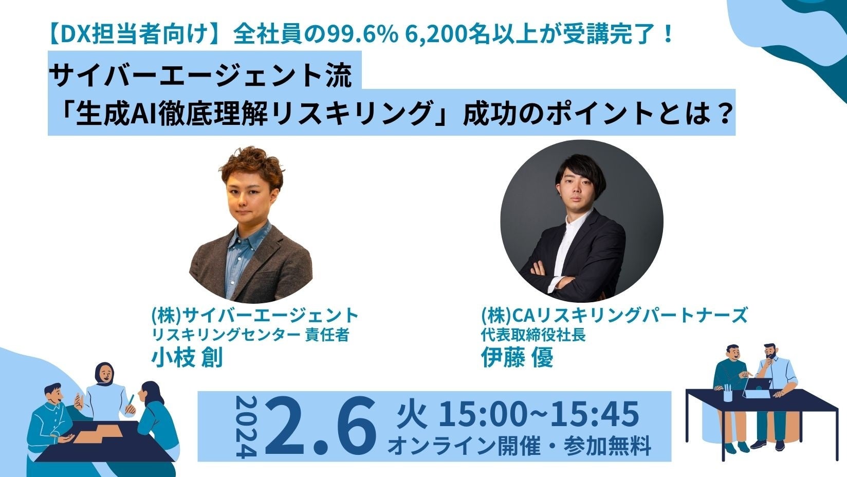 サイバーエージェントにて生成AIを含めたリスキリングを推進するリスキリングセンター責任者の小枝と、当社代表取締役社長の伊藤が、企業において生成AIの理解を深め、企業内で徹底的に生成AIを活用するためのポイントや、生成AIリスキリング推進のポイントを解説いたします。
