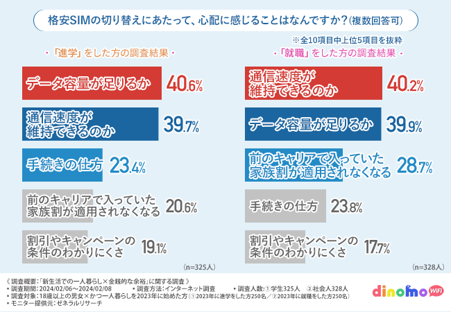 続いて、2023年に進学をした方に「格安SIMの切り替えにあたって、心配に感じることはなんですか?(複数回答可)」と質問したところ、データ容量と通信速度以外では、手続きの仕方が23.4%で、3番目に多いという結果がでました。