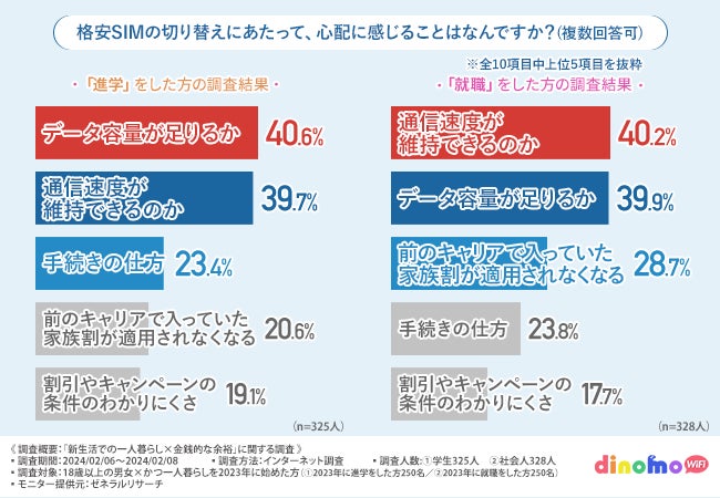 続いて、2023年に就職した方に「格安SIMの切り替えにあたって、心配に感じることはなんですか?(複数回答可)」と質問したところ、通信速度とデータ容量以外では、家族割の適用についてが28.7%で、3番目に多いという結果がでました。