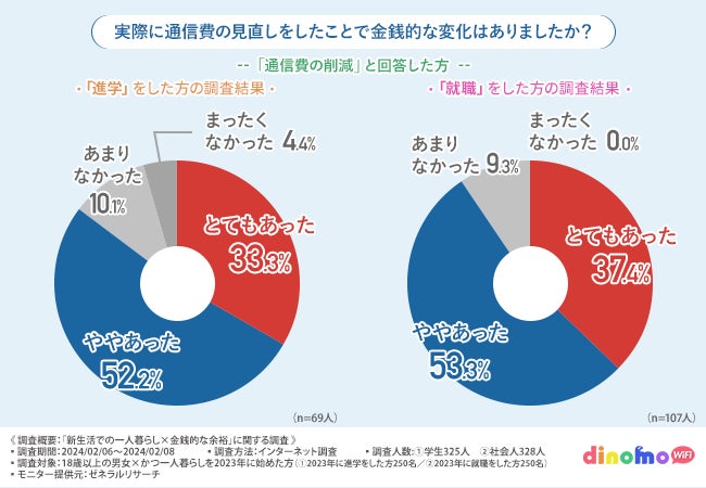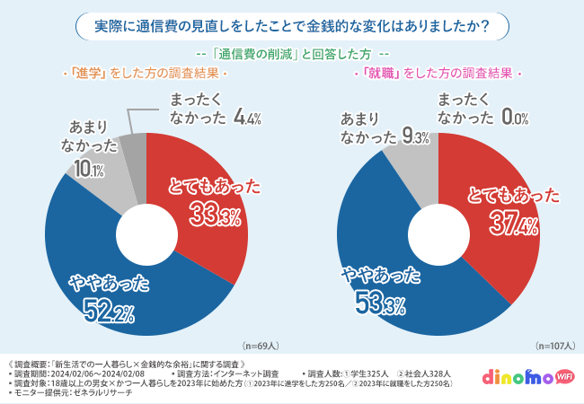 また、通信費の見直しについて進学した方の8割以上、就職した方の9割以上が金銭的な変化があったと回答しました。