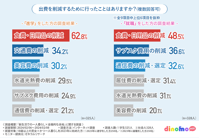 出費を減らすためには食費や日用品への出費を抑えるという回答が多かったものの、就職した方の約3割が通信費を見直していることが明らかになりました。