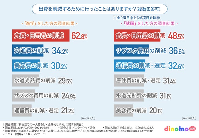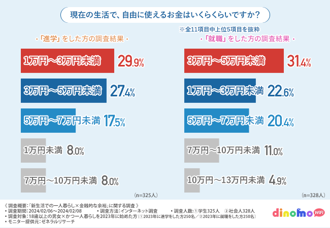 そこで今回、衝撃コスパWi-Fiサービス『dinomoWiFi』(https://dinomo.jp/wifi/)を運営するGlobal Gateway株式会社は、18歳以上で2023年に1人暮らしを始めた男女(①進学した方/②就職した方)を対象に「新生活での一人暮らし×金銭的な余裕」に関する調査を実施しました。