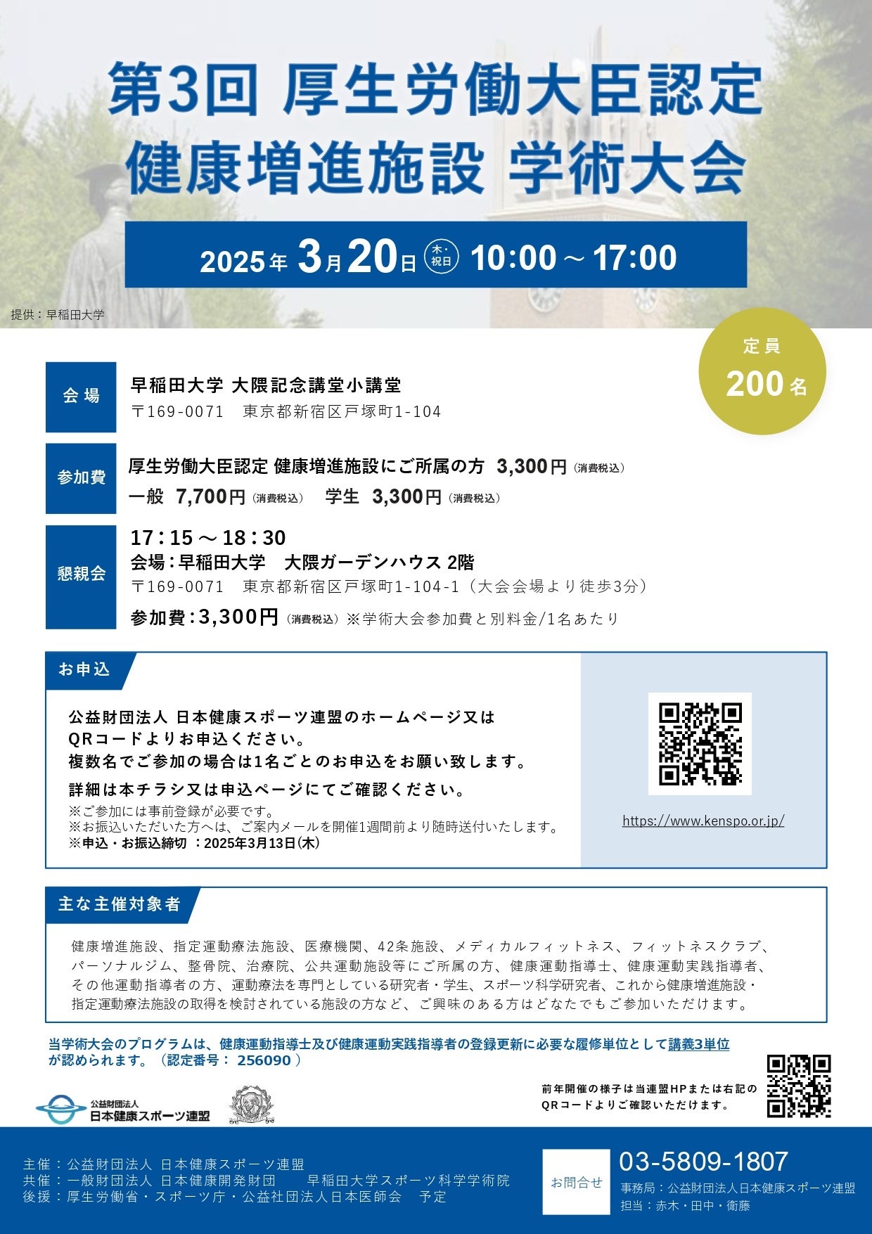 公益財団法人日本健康スポーツ連盟は、3月20日(木・祝)に健康増進施設・指定運動療法施設のさらなる普及を目指し「第3回厚生労働大臣認定 健康増進施設学術大会」を、早稲田大学大隈記念講堂小講堂にて開催いたします。