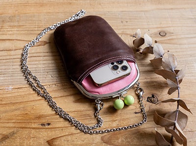馬革をたっぷり使ったスマホポシェットです。スマホは前面ポケットにも、がま口ポケットにも収納可能です(スマホのサイズにより入れられない場合もあります)中には定期券などを収納できるカードポケットがあります。チェーン付きでショルダースタイルにも。小さなバッグとして、お財布としても活躍できるアイテムです。