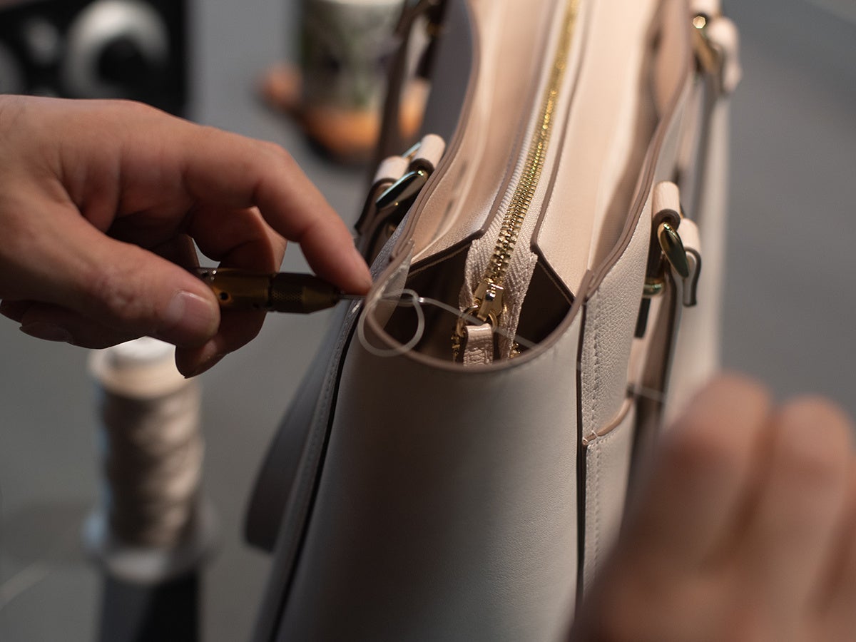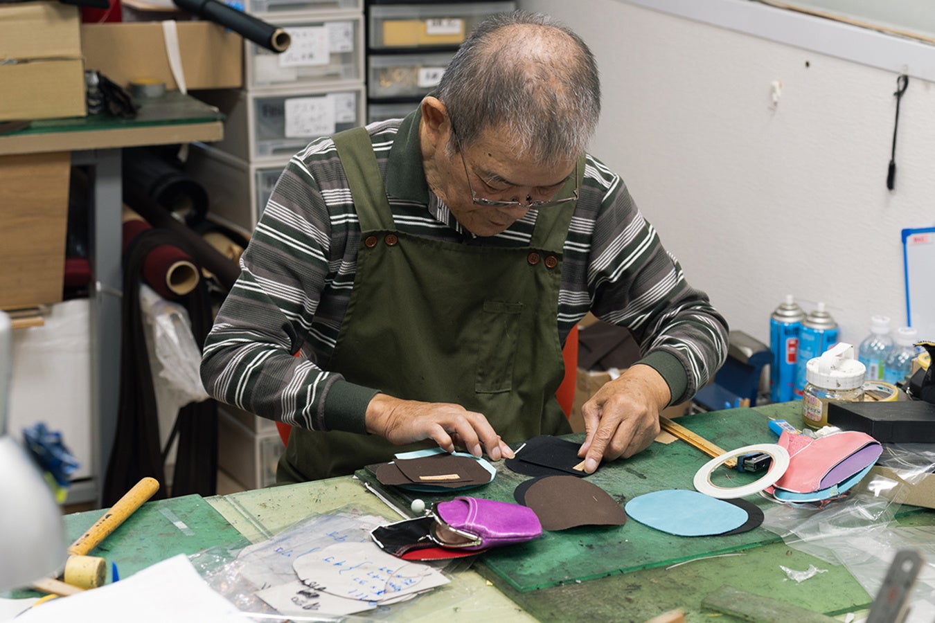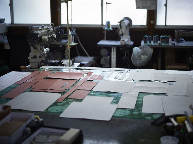 革製品をつくるには、デザイン、型紙作成、裁断、漉き、パーツ加工、縫製、金具取付、仕上げなど、たくさんの工程があり、その多くは繊細な技術を必要とする手仕事となります。革は天然素材のため一枚一枚、厚みや柔らかさ、風合いが異なるため、熟練の職人はその微妙な違いを確かめながら、長年培ってきた勘と技で正確に行います。日本の職人のつくる革製品は、品質が高く信用できると言われています。高い技術を持つ職人たちがつくる製品は、世界中で高い評価を受けているのです。