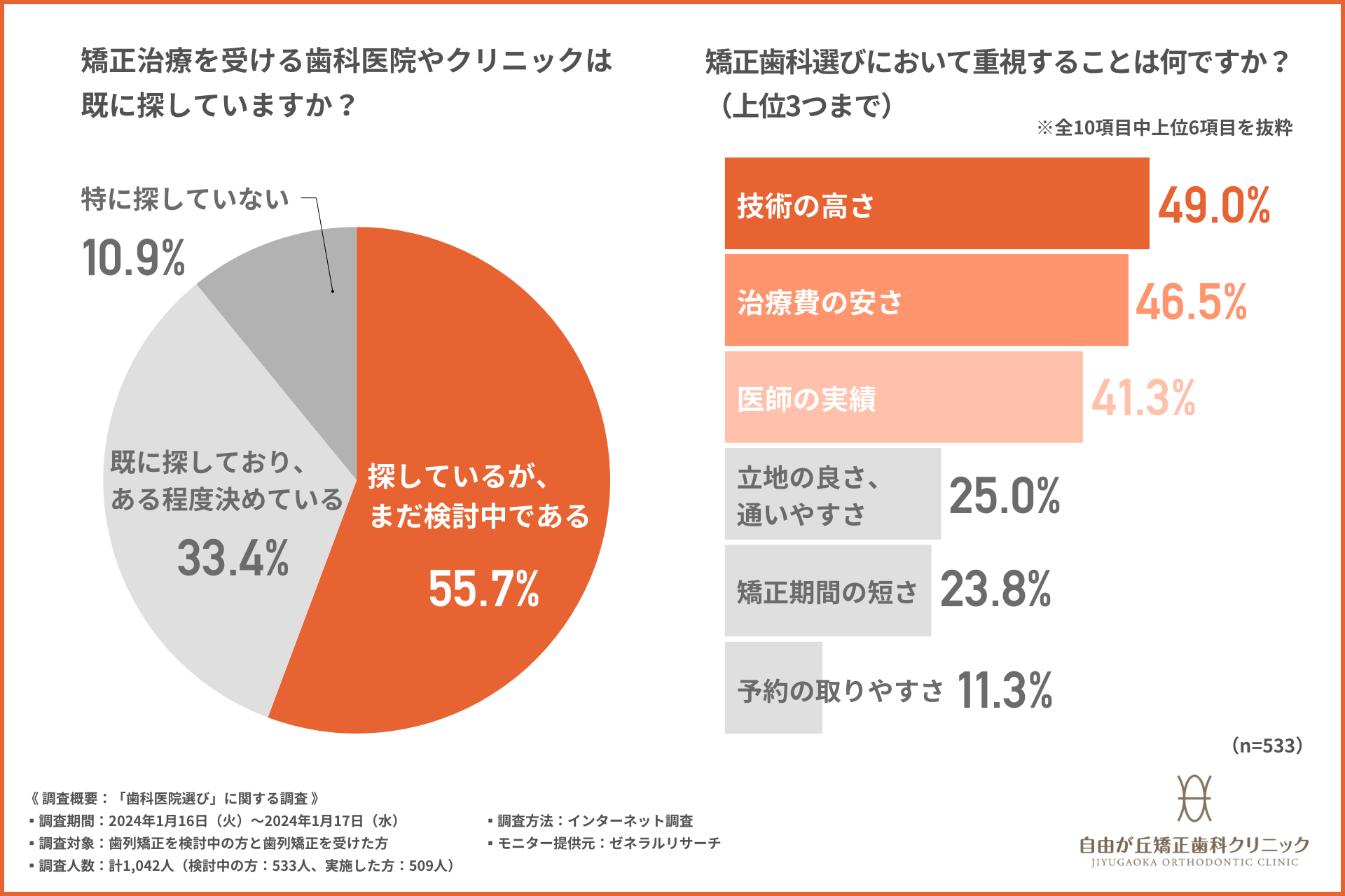 そこで今回、自由が丘矯正歯科クリニック(https://402415.com/)は、歯列矯正を検討中の方と矯正治療を実施した方を対象に「歯科医院選び」に関する調査を実施しました。