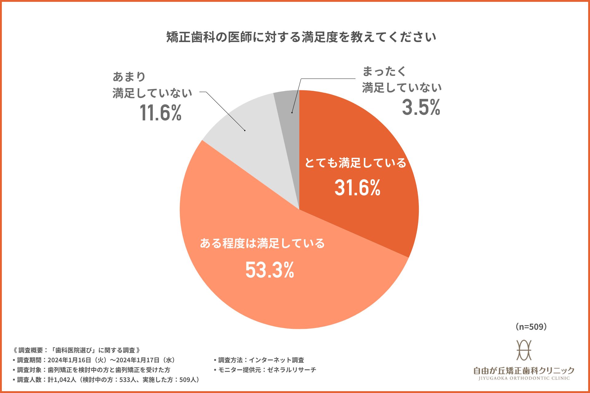 続いて「矯正歯科の医師に対する満足度を教えてください」と質問したところ、『とても満足している(31.6%)』『ある程度は満足している(53.3%)』『あまり満足していない(11.6%)』『まったく満足していない(3.5%)』という回答結果になりました。